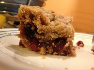 Home! Yay sleeping, yay parents, yay doing my homework before arriving! Also, yay real food, real appliances…real good. To kick start the Thanksgiving bake-a-thon 2012 (disclaimer: not a real tradition), I continued the use-up-all-old-ingredients theme and substituted the apricots in my Gourmet cook(ie)book’s “Apricot Chews” recipe for pomegranate-infused craisins. Yeah…definitely thought those were dried pomegranate seeds a couple weeks ago. Layer of cooked-ish craisins between layers of saturated fat and carbs (mostly butter, sugar, oats and flour). This dessert also called for some improv, as I did not have one pound of craisins, but I was successful once again.
