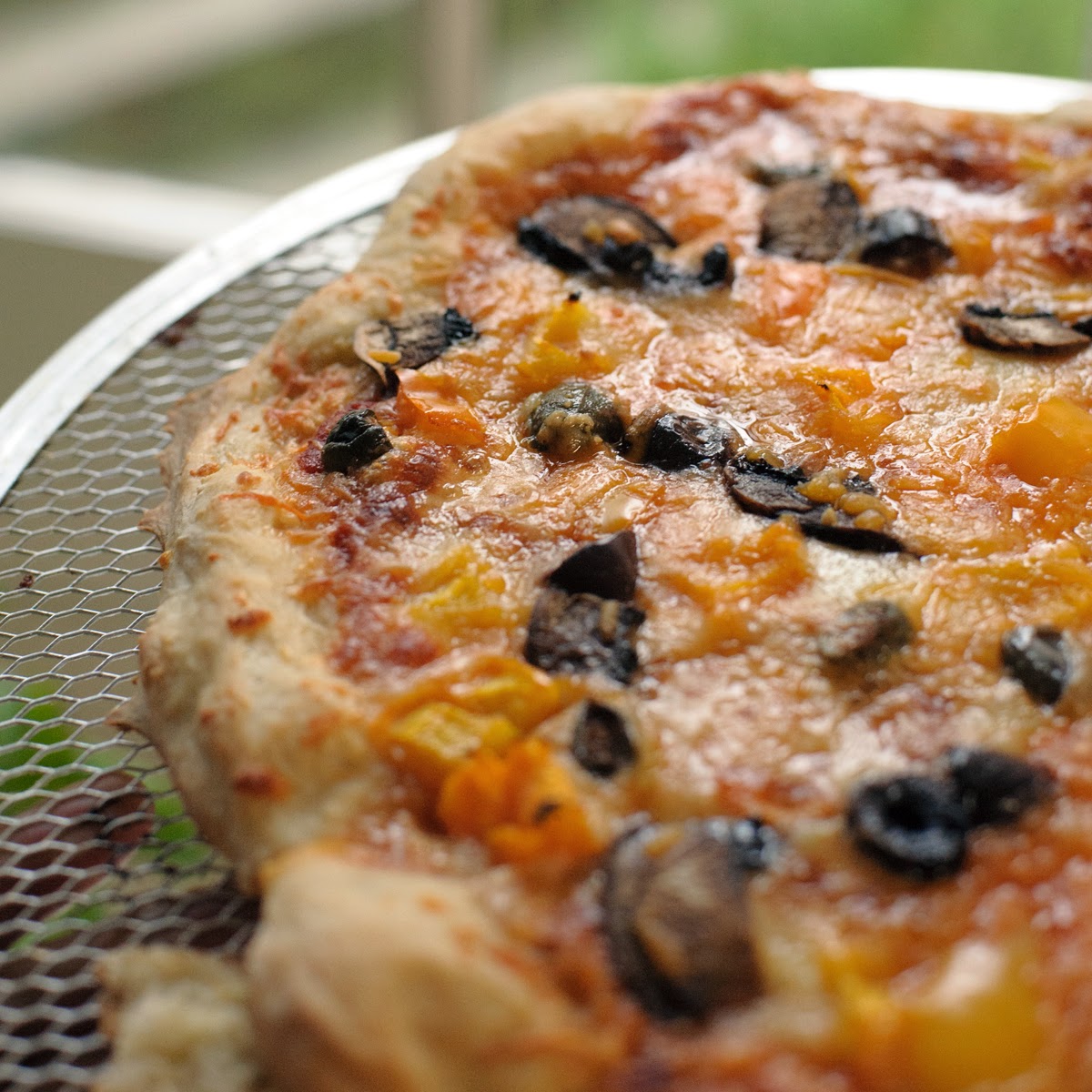 Now for the can’t-go-wrong hodge podge: mushrooms (always mushrooms), yellow and orange bell peppers, olives, caper berries. Yes. I feel like there’s never enough space on one pizza, definitely not as much as you thought there would be. How colorful…looks full to me!