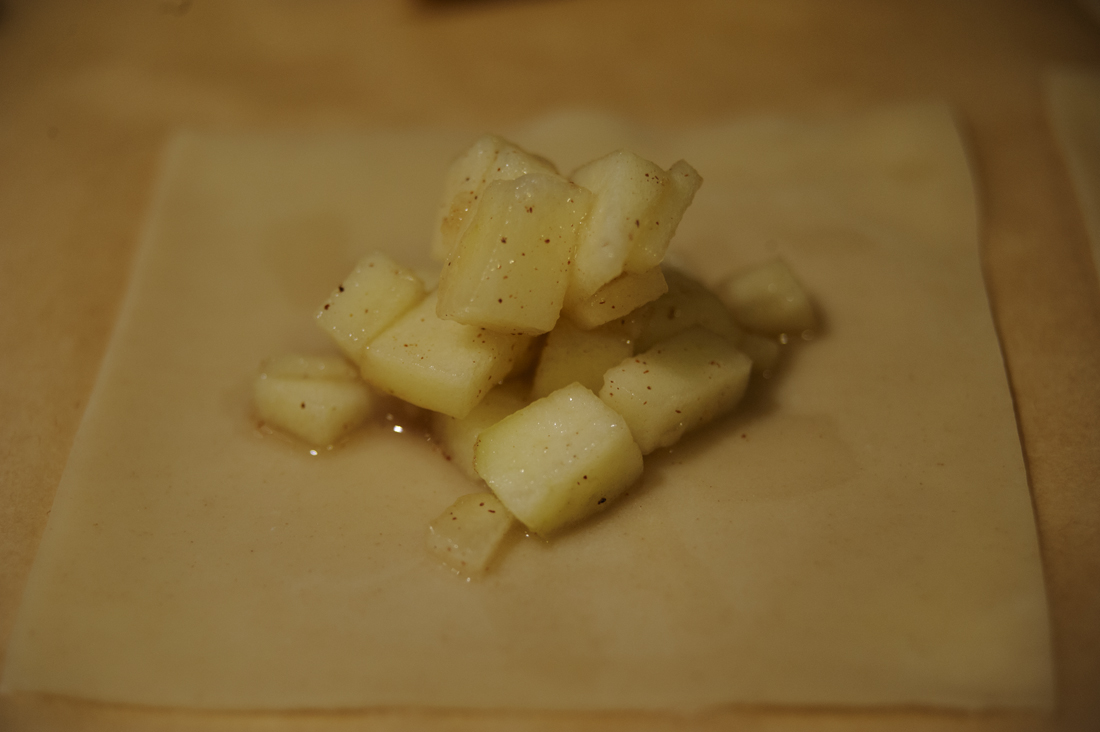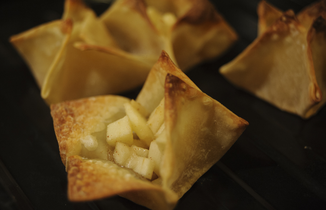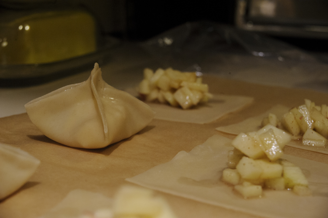 2. Lay out wonton wrappers and top with a heaping teaspoon of apple filling. Wet the edges of the wrapper and seal into an attractive pocket