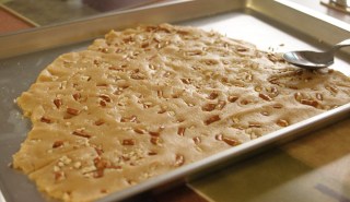 Nibs, shelled and broken up. They kind of look like brains from the fold-like cracks that make the nibs come apart easily. I would, however, recommend chopping a little after that to make the bits even smaller. Some of my bites were a little too nibby.