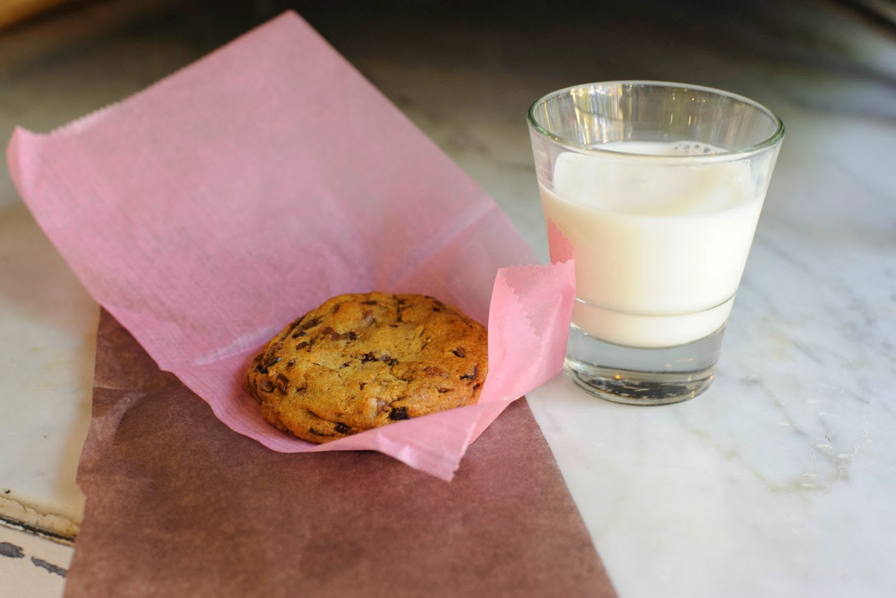 So another As Seen on “Unique Sweets” player here is Goody Goodie Cream and Sugar. This place is tucked away very nicely in what I guess is technically Mission. Nothing much is in the area, except some excellent chocolate chip cookies. I met the woman behind the baked goodness, Remi Hayashi. She was very kind and filled me in on her secret when I asked her what was crunching in the goody goodie cookie, with four different kinds of chocolate: cocoa nibs. Nuts, right? No, not nuts at all. This is all chocolate and almost no batter (once you bite into it). I would say a definite 2:1 chocolate to dough ratio here, no lie. And what’s better than a free milk shot to go with your cookie? Not much.