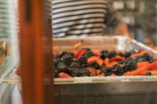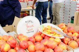 This farmer’s market though…the biggest in the city, is up and running Tuesday, Thursday and Saturday. Saturday is from 8-2pm, and as you can imagine, the chef/restaurant owners don’t fancy wading through the crowd for the leftovers at noon, so the die hards get there right at 8 am for the best pickings and fewest people. One Saturday morning I got up at 7 just to get to the farmer’s market when it wasn’t crowded. I don’t do too well with crowds and grocery shopping: ask my classmates and they’ll tell you I wait until 10 pm to go to Wegmans. Well I got to the farmer’s market and while it was foggy, it was just so pleasant. Also beautiful (note tomato arrangement above). So many stone fruit samples. How else do you pick where to get your $3.50/lb nectarines?