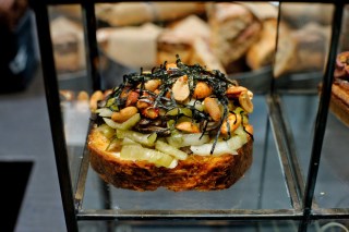 | “Sandwich”: Shitake, bok choy, kimchi savory cake, peanuts (sic). $8. I’m not even sure what some of that means. Was the kimchi baked into that toast? |