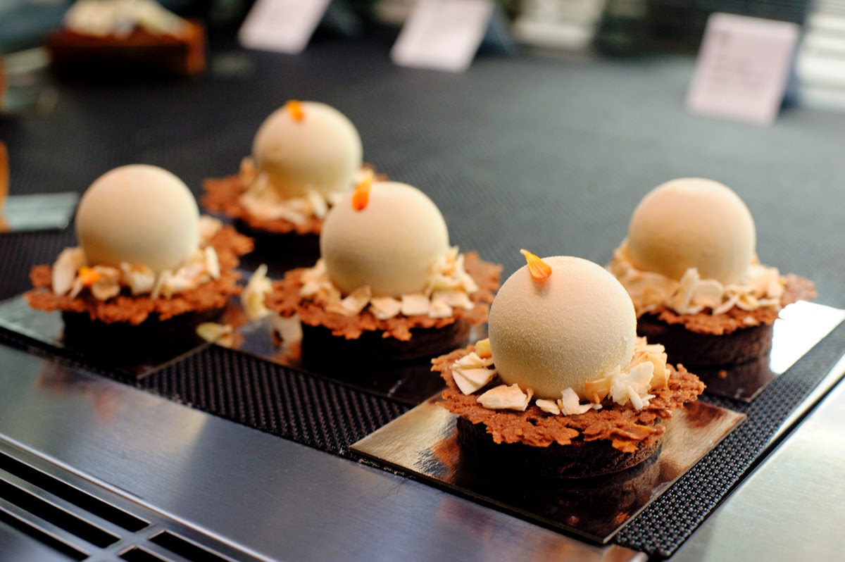 I would buy this spherical tart just out of curiosity on how to eat it. Seriously, how do you eat that? Is it soft and moussey? Hard and fudgy? But you have to applaud how they put these things together to make them look like bird nests. And that petal of whatever it may be.