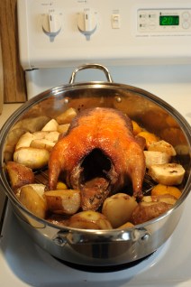 We went with a dry rub of cayenne, garlic powder, sage and salt on the hens and vegetables (we subbed sage for thyme on one hen), and covered for the first half of the roasting, at 375° to keep the juices in. Then we uncovered it for browning. Before are photos of before the oven, halfway through cooking, and done.