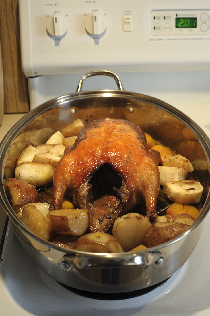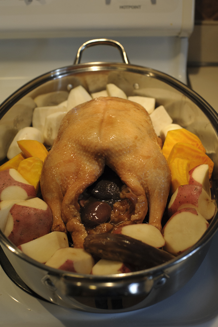 We went with a dry rub of cayenne, garlic powder, sage and salt on the hens and vegetables (we subbed sage for thyme on one hen), and covered for the first half of the roasting, at 375° to keep the juices in. Then we uncovered it for browning. Before are photos of before the oven, halfway through cooking, and done.